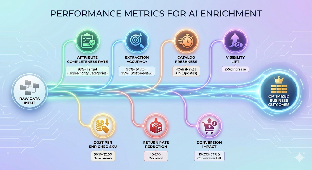 Measure business outcomes, not just technical metrics. Extraction accuracy is table stakes. What matters is whether enriched products surface more often, convert better, and generate fewer returns.