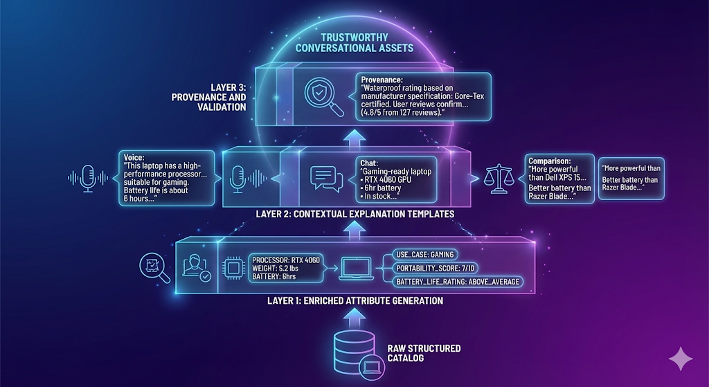 That response requires more than structured attributes. It requires generative outputs that combine product data, inventory context, reviews, and conversational framing into assistant-ready formats.