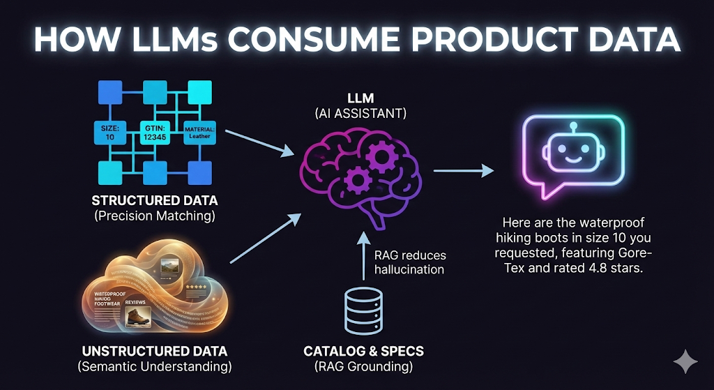 When someone asks ChatGPT or Rufus "show me waterproof hiking boots for cold weather," they don't want a data dump. They want a natural explanation: "This boot matches your needs—Gore-Tex waterproofing, insulated for temperatures down to -20°F, available in your size at the store near you, rated 4.8 stars from 500 verified purchases."